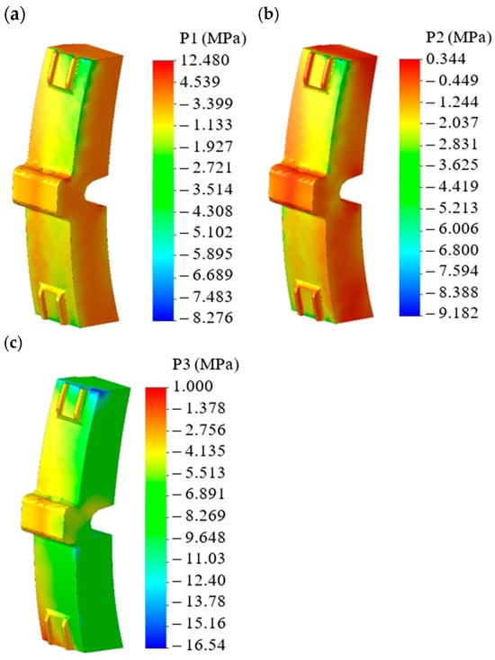 Results of the strength calculation for the pad: (a) the 1st principal stress; (b) the 2nd principal stress; (c) the 3rd principal stress.
