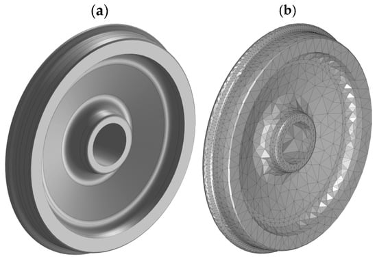 Solid-rolled wheel of a wagon bogie: (a) spatial model; (b) finite element model.