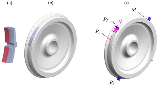 The design model of the wheel: (a) working surface of the pad; (b) linings on the wheel; (c) features of the load application.