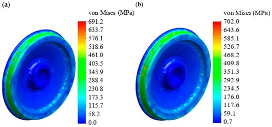 Thermal stress state of the wheel: (a) when interacting with a brake pad that has nominal parameters; (b) when interacting with a brake pad that has wear.