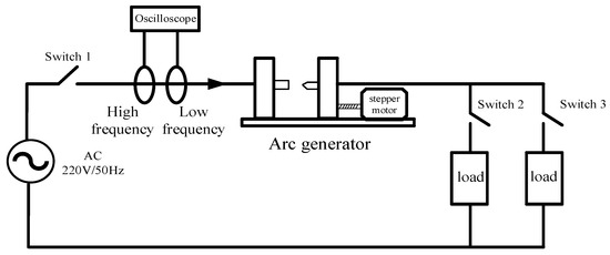 According to GB/T31143—2014 “Arc Fault Protection Appliances (General Requirements for AFDD),” [18] an independently designed and constructed AC arc fault signal acquisition platform suitable for 220 V has been established. The arc fault device consists of a fixed electrode and a moving electrode controlled by a stepper motor. The material of the fixed electrode is a stone grinding rod, while the moving electrode is a copper rod. The experimental platform mainly includes an experimental circuit and measuring equipment. The experimental circuit primarily comprises a 220 V/50 Hz AC power supply, an arc fault simulator, and a load in series. Among these, the arc fault simulator is connected to the load and oscilloscope, generating arcs when the electrical appliance operates; the oscilloscope is used to collect the load current signal; and high-frequency current transformers (cut-off frequency: 10 KHz) and low-frequency current transformers (cut-off frequency: 5 KHz) connected to the oscilloscope are linked to the live wire of the load, obtaining the operating current of the load. The torque of the stepper motor is 0.55 N.m and the step angle is 1.8. The experimental platform is shown in Figure 1.