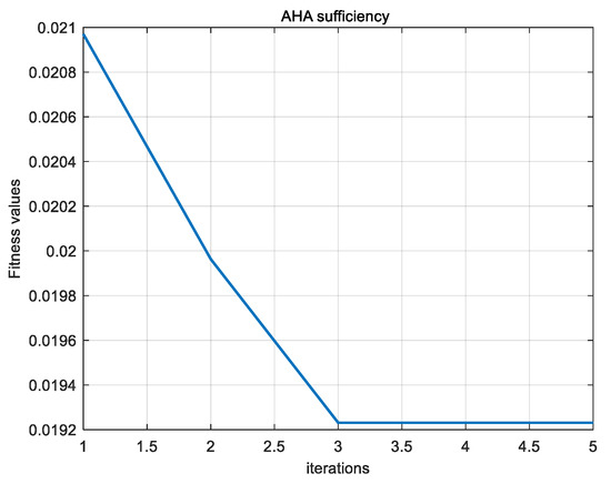 Step 4: Use the AHA algorithm to optimize the five key parameters of XGBoost (number of trees, depth of trees, minimum weight sum of subnodes, learning rate, and sample ratio), and input the training set for training. Figure 6 shows the value of AHA fitness.