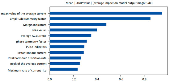 In this study, the SHapley Additive ExPlanations (SHAP) framework was used to quantitatively analyze the contribution and influencing mechanism of the 11 selected features to the prediction results of the series arc fault detection model. As can be seen from Figure 8, all 11 features show a predictive influence that cannot be ignored, which jointly verifies their effectiveness for the detection task. Although there are significant differences in the influence of each feature, the SHAP value of any feature is consistently clustered around zero. This suggests that each feature provides unique and complementary information to the model. Crucially, the influence of the features associated with the mean value of the average current and amplitude symmetry factor is always at the forefront, which is highly consistent with the known physical properties of the tandem arc. The SHAP dependency diagram further illuminates the nature of these relationships, revealing both the expected monotonic tendencies and more complex nonlinear interactions between certain features and the predicted arc failure probability. This comprehensive SHAP analysis demonstrates the effectiveness of the selected feature set in capturing the discriminant features of series arc faults.