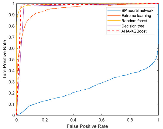 Figure 11 shows the AUC curves for the five models: BP neural network with an AUC value of 0.9605, extreme learning with an AUC value of 0.9540, random forest with an AUC value of 0.9726, decision tree with an AUC value of 0.9582, and AHA-XGBoost with an AUC value of 0.9925. The AUC value of AHA-XGBoost is closest to 1, indicating that the fault detection method proposed in this paper can prioritize arc faults.