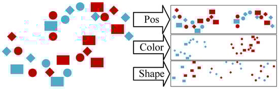 A dataset of objects with three properties (position, colour, and shape) and the “natural” clustering emerging from any of these properties. In the clustering based on the position, the elemnts are grouped based on the moon, they are positioned in. In the clustering based on the colour, the objects are split in a red and a blue group. In the clustering based on the shape, the objects are split in the groups diamond, circle and square.