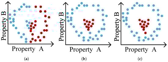 To be interesting in a set of clusters, a cluster must not only be “good” to some extent (most likely measured by a Quality function) but also unique in some kind of way. If we consider the three clusterings in Figure 4, we can see that two of these three (Figure 4b,c) clusterings have a very strong similarity and only differ in the labelling of one object, whilst the other clustering (Figure 4a) is vastly different. If we need to select two clusters from this set, it would grant little to no extra value for a practitioner if these clusters are as shown in Figure 4b,c, since it is highly unlikely that the single changed object will lead to many new insights. The other clustering, however, even while intuitively “worse” than the other two, would grant more insight as an addition to the other clustering (furthermore, it might even be the better fitting clustering, if Property B turns out to be irrelevant.). For this reason, the Interestingness function will need to weight the novelty and the quality of a clustering.
