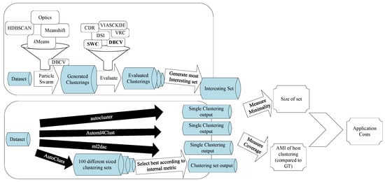 - Francia, M.; Giovanelli, J.; Golfarelli, M. AutoClues: Exploring Clustering Pipelines via AutoML and Diversification. In Proceedings of the Advances in Knowledge Discovery and Data Mining—28th Pacific-Asia Conference on Knowledge Discovery and Data Mining, PAKDD 2024, Taipei, Taiwan, 7–10 May 2024; Proceedings Part I 2024 Lecture Notes in Computer Science. Springer: Berlin/Heidelberg, Germany, 2024; Volume 14645, pp. 246–258. [Google Scholar] [CrossRef]