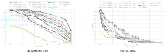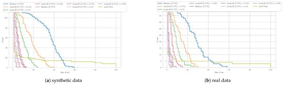 autoClues [21] is the method most similar to our method. Here, a number of clusterings are generated, and subsequently, the k most diverse and high-valued clusterings is returned. The method uses Maximal Marginal Relevance (MMR) [49] from the field of diversification [50]. The clusterings are evaluated by a single CVI and are compared to each other using a diversity function , where is the similarity measured by the Adjusted Mutual Information (AMI) [51]. The CVI used in most standard scenarios is the Silhouette Coefficient [52] on a two-dimensional projection of the dataset using t-SNE [53]. At first, the clustering with the highest is selected for the result set R and the first intermediate set . Afterwards, the remaining elements are selected iteratively, where each selected element minimizes the MMR when added to set as follows: