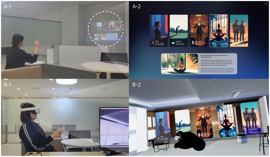 Natural User Interfaces (NUIs) have been designed to enhance user interactions by utilizing instinctive human actions like hand gestures, eye gaze, and voice commands, aiming to make the perception of the user experience smoother and more intuitive [13]. A NUI focuses on reducing the learning curve by aligning interactive behaviors with the user’s physical and cognitive habits—for example, employing mid-air gestures to browse or manipulate digital contents [14]. Research on tactile and gesture-based systems has shown that physically interacting with digital elements improves users’ spatial recall and lessens their cognitive strain, as users feel that the interaction is like a natural extension of their body movements [15,16]. Similarly, a NUI promotes interacting with digital contents through intuitive actions—for instance, swiping or waving a hand to dismiss contents rather than clicking a delete button [17]. This method reflects the concept of hands-on interaction, enabling users to feel as if they are physically engaging with and handling digital components [18]. Additionally, NUI-based systems typically respond to environmental cues, offering context-aware suggestions and adjusting in real time to users’ interaction patterns [19].