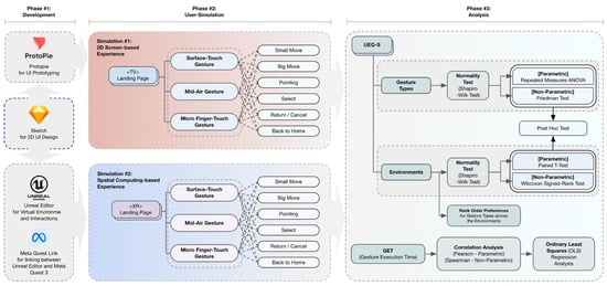 To systematically investigate gesture-based interactions in different user interface environments, this study is structured into three main sequential stages: the development phase, the user simulation phase, and the analysis phase (Figure 2). Firstly, the development phase involved (a) the process of designing a user interface using Sketch (ver. 67.2, Bohemian Coding, The Hague, Netherlands); (b) the process of prototyping a 2D interface using Protopie (ver. 9.1.0, Studio XID, Seoul, Republic of Korea); and (c) the processes of developing, linking, and prototyping the interactions in a 3D spatial user interface using Unreal Editor (ver. 5.2.1, Epic Games, Cary, NC, USA) and Meta Quest Link (ver. 76.0.0.452.315, Meta Platforms, Menlo Park, CA, USA). Based on designing the basic UI architectures and components in Sketch, these UI outputs were then migrated into both Protopie and Unreal Editor, where they were appropriately applied to interaction frameworks for interactive prototyping in both 2D screen and 3D spatial environments. Also, to enable augmentation of the spatial user interface, Meta Quest Link works as a bridge platform that links Unreal Editor and Meta Quest 3 (Meta Platforms, Menlo Park, CA, USA). For hand recognition and interactions in virtual interfaces within XR environments, we purchased the Hand Tracking Plugin (ver. 0.6.3) developed by Just2Devs on Epic Games Launcher (Epic Games, Cary, NC, USA) [53] and also used the Meta XR Plugin (ver. 1.88.0, Meta Platforms, Menlo Park, CA, USA) from the Meta for Developers website [54].