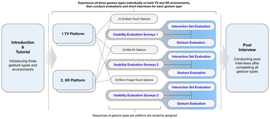 In this study, we adopt a controlled within-subject experimental design [66] to compare the gesture-based interactions across two platforms (TV and XR) and three gesture input types. Each participant experiences the conditions of both platforms—a conventional TV-screen-based 2D interface and a 3D spatial interface in a virtual space reminiscent of the real environment. Under these environmental conditions, the participants are guided to use all three gesture modalities in each environmental context: (a) Surface-Touch gestures (touch-based input on a physical surface); (b) mid-air gestures (free-hand movements in mid-air); and (c) micro finger-touch gestures (subtle finger-level touch input on the side surface of the index finger on which the smart ring mockup is worn). These three gesture types are repeatedly performed in two discrete environments (TV and XR) as six conditional combinations. Also, as mentioned, a within-subject design is chosen to allow for direct comparisons of the conditions by the same individuals. To mitigate learning or ordering effects, the sequences of the gesture types and the user testing order are randomly rotated in a Latin-square design [67,68]. This pre-condition ensures that no one faces the same gestural procedure and the same environment first.