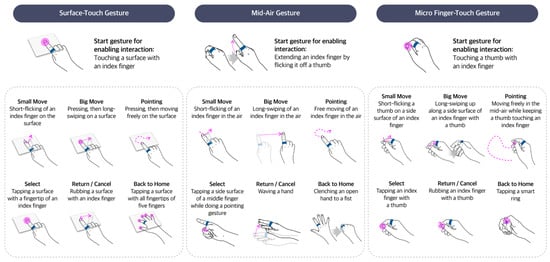 In terms of comprehensively exploring the gesture-based interactions within both conventional and immersive environment settings, this study adopted a triadic gesture classification consisting of Surface-Touch gestures, mid-air gestures, and micro finger-touch gestures (Figure 4). The selection of these gesture types was grounded in a synthesis of prior empirical studies and cognitive ergonomics, ensuring that each modality addressed a unique facet of user input behavior relevant to its interaction context.