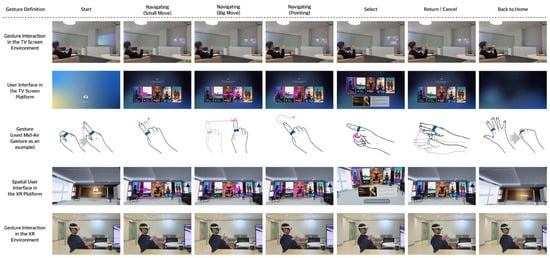 For each experimental condition, the participants perform a set of equivalent tasks on the given platform using the assigned gesture modes in terms of aligning with common user objectives. For both the TV-screen platform-based and XR-platform-based scenarios, they are instructed to carry out a range of related actions, including navigating card components on the landing page, selecting a card component to enter the content details page, or canceling a selection to return to the landing page (Figure 5). The assigned tasks are kept as similar as possible across the TV and XR so that the usability performance can be compared fairly across platforms and gesture modalities.