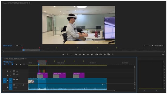 During the experiment, each task was video-recorded for each participant (with consent prior to the simulation) from an angle that captured the participants’ hand gestures in interacting with the TV-screen-based interface and the XR-based spatial user interface. Also, the monitoring screen that controlled and monitored the interfaces (especially the first-person view via the Meta Quest 3) of the TV and XR platforms in each instance was screen-recorded to check the overall usability of the hand gestures as well. The entire recordings per participant were saved as anonymous documents and were later reviewed to conduct in-depth observations of usability. The objective measure was the “gesture execution time (GET)” for each gesture type. Via Adobe Premiere Pro (ver. 25.2.3, Adobe Inc., San Jose, CA, USA), the time intervals that represented the GET for each individual gesture type were observed, and the interval within a recorded video clip was marked using a marker tool (Figure 6) to visually identify the intervals where specific gestures were performed in the video clip.