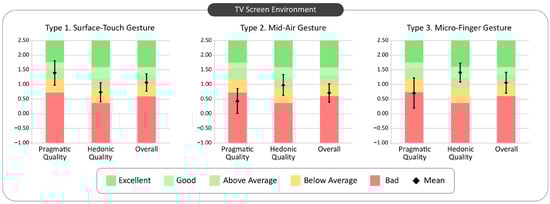 Based on the user data collected from the surveys, this study analyzes the participants’ experiences with different gesture types in TV and XR environments using Python (v.3.13) for data processing. The methodology encompasses several analytical procedures as follows. The participants’ responses in the UEQ-S from the survey were processed using the UEQ-S data analysis tool [69]. This tool provides statistics and comparative outcomes, enabling a clear understanding of the users’ hedonic and pragmatic perceptions across different experimental conditions. Based on this setting, we conducted internal consistency analyses (Cronbach’s α) for two distinct dimensions that the UEQ-S contained: pragmatic and hedonic quality. For both dimensions, the Cronbach’s α values exceeded 0.7 across all gesture types, indicating acceptable reliability. Additionally, we referred to the benchmark data provided by Team UEQ to comparatively interpret the score levels for each gesture type across the environments.