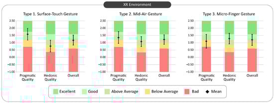 For the XR environment (see Figure 8 and Table 3), the evaluation results show similar yet distinct trends. The Surface-Touch gesture again ranked highest in pragmatic quality (“Good”) and lowest in hedonic quality (“Below Average”). Interestingly, although this gesture type received the highest overall satisfaction in the TV environment, it ranked the lowest among all three gesture types on the XR platform, with an overall satisfaction score of 1.17 (“Above Average”). On the other hand, the evaluation of the mid-air gesture was improved notably in this context, obtaining the second highest pragmatic quality rating (“Above Average”) and moderate hedonic quality evaluations (“Above Average”). Remarkably, despite being rated negatively in the TV environment, this gesture type received the highest overall satisfaction score (1.22, “Above Average”) in the XR environment. Also, the micro finger-touch gesture exhibited similar patterns to those in the TV environment. This gesture rated lowest in terms of its pragmatic quality (“Below Average”) but highest in hedonic quality (“Good”), thereby achieving the second highest overall satisfaction (1.20, “Above Average”).