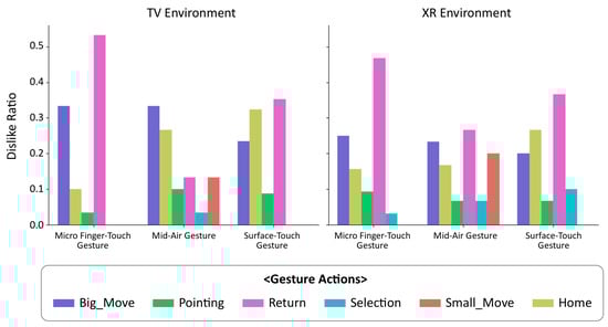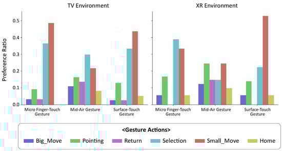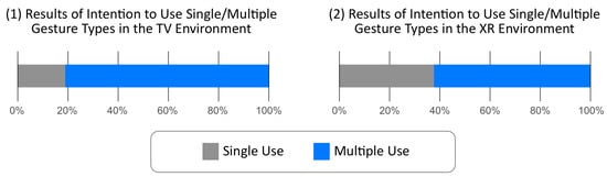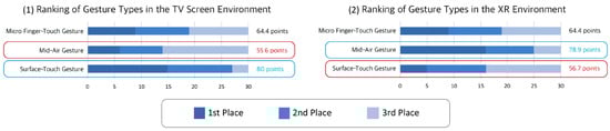 The analysis revealed no clear statistical differences among the three gesture types in the XR environment. However, it is noteworthy that, in line with the findings in the TV environment, the Surface-Touch gesture was perceived as relatively less engaging, while the Micro Finger gesture was considered the most enjoyable. Interestingly, although no statistical difference was confirmed, the Mid-Air gesture—which received the most negative evaluations in the TV environment—showed the highest mean score in overall satisfaction in the XR environment. Conversely, the Surface-Touch gesture, which had received the most favorable evaluations in the TV environment, recorded the lowest average score in the XR environment. These findings may suggest that the nature of the XR environment—allowing gesture execution without the need for physical devices—may have increased the perceived utility of Mid-Air gestures compared to Surface-Touch gestures, potentially enhancing users’ sense of immersion and freedom.
