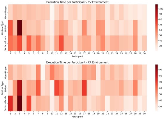 The measurement method for the duration of the performed gestures was organized as follows. In the TV and XR environments, the total duration of each ring gesture was measured under the default conditions of a 30 fps timecode. The measurement began the moment that a user raised their hand or wrist to initiate a small movement and ended when the final home gesture was completed, triggering a screen transition. Even if gestures were repeated for confirmation or there were long intervals due to conversation, these durations were included in the total time, as higher engagement (hedonic quality) implies focus on the gesture. Additionally, if no corresponding video was available, XR measurements were taken using the monitoring screen recordings.