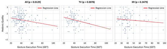 To examine the relationship between the gesture execution time (GET) for each gesture type (see Section 3.4.1) and the user experience measured through the UEQ-S scores further, an additional correlation analysis was conducted. After testing for normality, an appropriate correlation method—either Pearson’s or Spearman’s—was applied to assessing the relationship between the two variables. In addition, Ordinary Least Squares (OLS) regression was performed to more clearly identify potential linear associations between gesture efficiency and user satisfaction. All statistical analyses were executed using the Python (v.3.13)-based SciPy (v.1.15.2) and Statsmodels (v.0.14.04) libraries, facilitating a comprehensive evaluation of the differences in the user experience metrics across the various gesture types and environments.