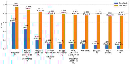 Several teams exhibit notable discrepancies between their PageRank and win-rate rankings. For instance, Taoyuan Agricultural & Industrial HS ranks fourth in PageRank but fifth by win rate, suggesting stronger opponents defeated and a higher performance value that is not reflected in the raw win percentage. In contrast, Yingge Vocational HS ranks higher by win rate but lower in PageRank, indicating that their success may have come against weaker teams.