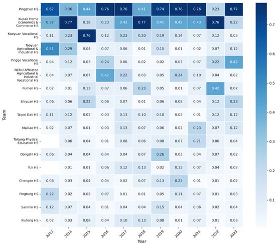 The heatmap illustrates a clear contrast between teams exhibiting sustained excellence and those demonstrating episodic success. Teams such as Pingzhen HS, Kupao Home Economics & Commerce HS, and Kaoyuan Vocational HS consistently display high PageRank values across multiple seasons, underscoring their long-term dominance and structural centrality within the tournament network. These stable patterns reflect not only frequent advancement into later rounds but also victories over strong opponents, which PageRank effectively captures through its recursive weighting mechanism.