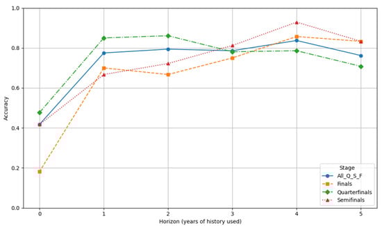 Figure 3 illustrates how accuracy varied by tournament stage. For quarterfinal predictions, using data from the current season and two previous years yielded the best results. Semifinal predictions required a broader historical window of three to five years to achieve optimal accuracy. Moreover, we observed that in high-stakes rounds such as the semifinals and final, predictive accuracy consistently increased with longer historical input.