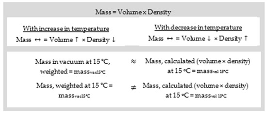 where tm is the temperature of LPP, V is product’s volume at temperature tm, ρ is measured product’s density at temperature tm, α is the coefficient of cubical thermal expansion, t is reference temperature. Under the conditions, when the assumed standard temperature is +15 °C, every 5 °C deviation from the standard temperature causes about 0.5% mass change, and respectively, each 10 °C deviation causes—0.95% mass change. This is a significant influence on the measurement result. In all applicable standards and recommendations main temperature correction aspects are discussed [52,53].