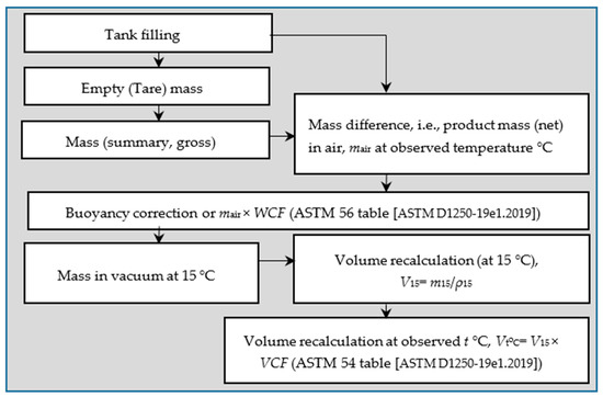 As mentioned before, product density depends on the temperature. For buoyancy correction, the density of the product at the observed temperature should be used, but usually the density from the product quality certificate, where it is given at +15 °C temperature, is used. To determine the influence of the density dependence on temperature on the result (i.e., mass in vacuum), we assume that the density of petrol ranges from 740 kg/m3 (at 15 °C) up to 745 kg/m3 (at 10 °C) [43]. This density change, due to the temperature change of 5 °C, influences the result by only 0.001%. This can be considered an extremely small value. If the density is measured at a factual temperature, it can be corrected to the density at 15 °C using ASTM Tables 53 [44]. According to the OIML G19 [45], the density is defined as the ratio of product mass (mass in vacuum) and its volume. Thus, we consider that the density specified in the certificates (determined by any method) is the density in vacuum. The diagram for direct product mass evaluation by weighing is given in Figure 3.