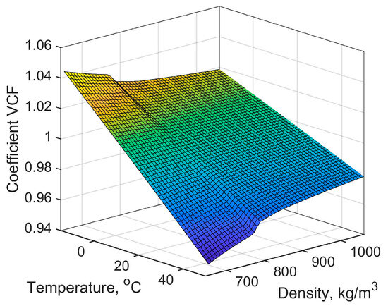 VCF coefficient is equal to the ratio of density at factual temperature and density at reference (+15 °C) temperature . Its variation is calculated according to ASTM 54B tables (for petroleum products) [16] and the following conditions: density range 653–1075 kg/m3; temperature range −15–50 °C.