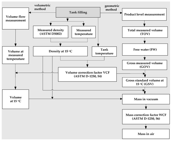When using the geometric method, the LPP volume in stationary tanks is determined by using level measurements together with the tank graduation tables [31]. For the volumetric method, the meter is used for the volume flow (debit) measurement. In addition, temperature and density are measured, and then mass is calculated [49,50].
