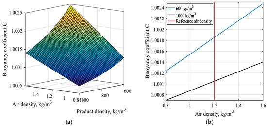 Figure 6a shows the dependency of the buoyancy coefficient in air on the density of air and petroleum products. Figure 6b shows two sections of this plane.