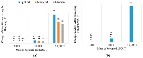 Although we acknowledge that the buoyancy coefficient does not affect the mass value of LPG in closed tanks, this does not apply to corrections related to the calibration or adjustment of weighing instruments. Therefore, a company’s loss management strategy should include investments in higher-precision measuring instruments (e.g., static weighing scales for cars and wagons with a verification scale division value of 20 kg, and 0.2% dynamic weighing scales for wagons). Additionally, regular maintenance of these instruments is crucial. Measurement errors can be reduced by applying known corrections to individual measurement results through calibration and verification protocols. If there are systematic positive or negative deviations in measuring instruments, or if the weighing errors exceed their verification scale interval, a correction may be applied to the measurement results. The results may be uncorrectable if average weighing errors are smaller than the verification scale interval. Ideally, weighing errors should be randomly distributed within the permissible error range for individual measurements. For all operations where applicable, it is advisable to use scales of the same accuracy class, with the same verification scale division value and weighing mode [58,59].