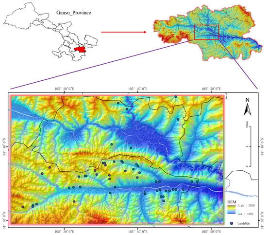 Tianshui City is located in the southeastern part of Gansu Province, in the middle reaches of the Weihe River, at the junction of the Shaanxi, Gansu, and Sichuan Provinces. National Highways 310 and 316 pass through the city, and urban–rural roads are well-developed, providing convenient transportation []. Based on the spatial distribution characteristics of landslides within the city and the coverage conditions of SAR data, this study selects the central region of Tianshui City as the research area, with geographical coordinates ranging from 36°29′ N to 36°46′ N and from 105°51′ E to 105°22′ E. The study area primarily covers the northeastern part of Maiji District, the northern part of Qinzhou District, and the adjacent areas of Gangu County, Qingan County, and Qingshui County, with a total area of approximately 1406.05 km2. The geographical location of the study area is shown in Figure 1.