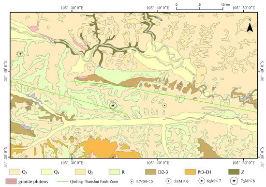 The study area is located in the transitional zone of the Longxi Loess Plateau, featuring significant terrain relief. Within the area, there are valley regions along the Weihe River and its tributary, the Jiahe River, presenting a typical mountain valley basin loess mound landform. As shown in Figure 2, the study area is situated at the complex intersection of the middle segment of the Yinchuan-Tianshui-Wudu belt in the Liupan Mountains’ north–south seismic zone and the central part of the Tianshui–Lanzhou belt along the northern margin of the Qinling Mountains’ east–west seismic zone [,,]. This region has a complicated seismic background with frequent activities. Due to the geological structure mainly consisting of loess, the rock layers are predominantly composed of weak mudstone and loess-mixed deposits. These formations are loosely structured and widely distributed, making them prone to geological disasters. Due to geological conditions, Tianshui City has a fragile geological environment and is a high-risk area prone to frequent geological disasters, mainly including landslides, collapses, and debris flows. On 23 July 2013, the city experienced a severe rainstorm, which triggered widespread landslides disasters that posed a serious threat to the lives and property of local residents []. Geological hazards have become a major constraint on urban development, making disaster prevention and mitigation a challenging task.