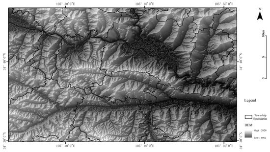 Digital Elevation Models (DEM) play a crucial role in InSAR processing and the identification of geological disaster points [,,]. Geological disasters such as landslides and debris flows are strongly influenced by terrain features like elevation and slope. Many studies consider topographic features as primary factors in the susceptibility of geological disasters. The Shuttle Radar Topography Mission (SRTM) data provided by the USGS Earth Explorer platform (https://earthexplorer.usgs.gov/ (accessed on 6 December 2024)) have a spatial resolution of 30 m. Figure 3 below shows the DEM data of the study area, which contains the region’s topographic information.