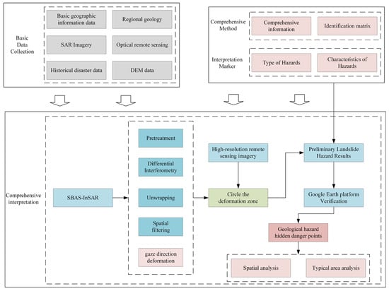 Research flow chart. Based on the collected fundamental data of the study area, a comprehensive landslide hazard identification method and interpretation marker were established. Initial potential landslide sites were identified using integrated techniques, verified via Google Earth, and subsequently analyzed through typical area analysis and spatial analysis.