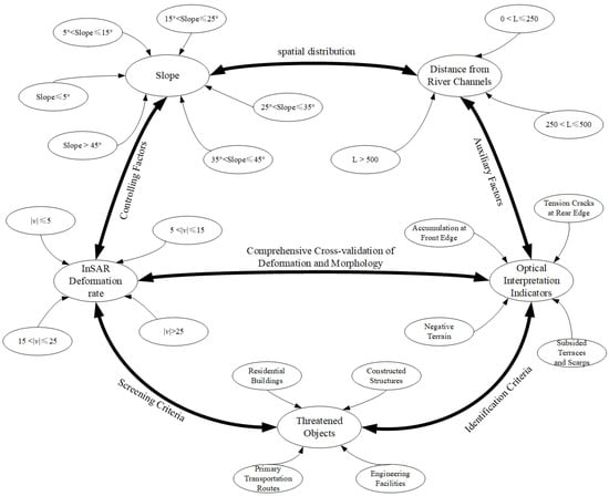 Traditional landslide hazard identification methods typically rely solely on ground deformation data derived from InSAR, which frequently result in missed detections and false identifications, reducing accuracy and increasing the burden of field verification. To address these issues, this study integrates terrain features, proximity to rivers, optical remote-sensing interpretation, and InSAR deformation monitoring results to comprehensively extract landslide deformation information, thereby enhancing identification accuracy (Figure 5).