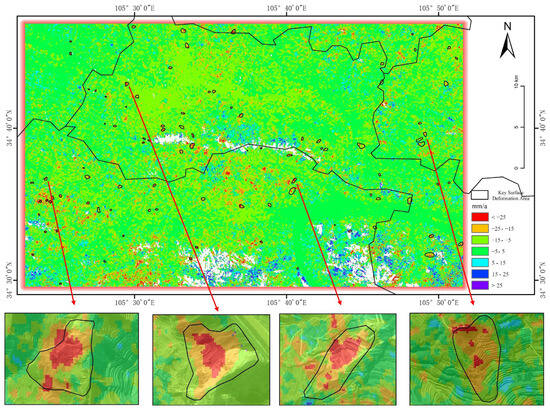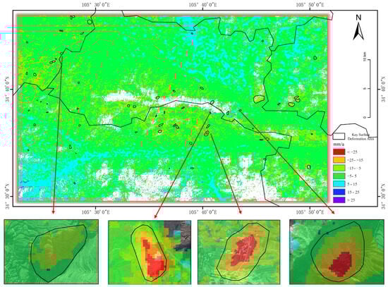 Ascending-orbit SBAS-InSAR deformation map. The surface deformation velocity in the study area ranges from −93.68 mm/a to 88.12 mm/a. Four typical deformation zones are highlighted in the lower part of the map, involving potential landslide hazards and anthropogenic activities.