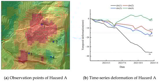 Based on the interpretation results from ascending and descending orbit SAR imagery, one representative landslide hazard site was selected from each dataset for time-series deformation analysis. Using InSAR-derived displacement data from multiple observation points, the temporal deformation characteristics of the hazard zones were evaluated.