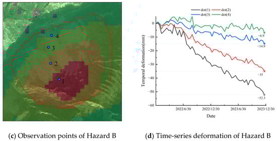 Landslide Hazard Point B was interpreted from the descending orbit SAR data. Similarly, four deformation observation points were selected for time-series analysis in this region. The results indicate that, between 2022 and 2023, the rear edge of the landslide-prone area experienced substantially greater displacement than the frontal accumulation zone, with a maximum cumulative deformation of −52.3 mm. The deformation was observed to gradually propagate outward from the central portion of the rear edge. Given the continuous deformation trend, it is recommended that this area will be subject to regular monitoring and hazard reassessment, as illustrated in Figure 8c,d.