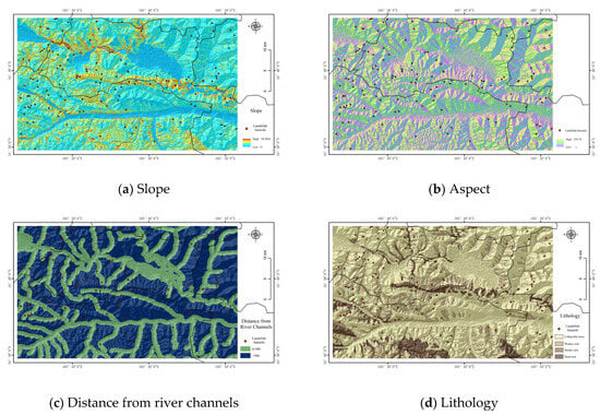 To gain deeper insights into the spatial distribution characteristics of landslide hazards, this study utilized the ArcGIS spatial analysis platform to systematically examine the relationship between the identified landslide hazard points and key geo-environmental factors within the study area []. The main influencing factors analyzed include lithology, slope gradient, slope aspect, and distance to river channels.