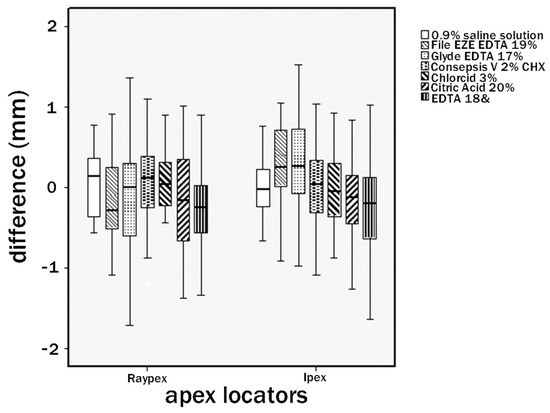 Studies have reported the accuracy of EALs for in vitro models using various canal irrigants [7,17,18,19,20,22,24,25,26,27,28,29,30]. In the presence of dried canals and a tolerance level of ±0.5 mm, the Raypex showed an accuracy of 80%, 82.07%, and 85.59% with instrument sizes 08, 10, and 15, respectively [31]. Measurements within the ±0.5 mm clinical tolerance range are considered to be highly accurate. We agree that a tolerance of ±0.5 mm can be permitted, because this accuracy level cannot be reached with any other working length determination method in clinical practice [34]. Our results showed that the Raypex EAL was accurate in the range of ±0.5 mm between 55% and 87.5%, depending on the canal irrigant. Additionally, the Ipex showed a similar accuracy of 55% to 82.5% within the ±0.5 mm range, depending on the canal irrigant.
