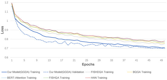 Subsequently, a comparison was made with FISHDQA, consisting of FISHQA with a dual attention mechanism similar to that of our proposed QGDA model. It achieved an F1-score of 73.16%, significantly outperforming the original FISHQA by 1.79% and BQGA by 1.65%. This suggests that the dual mechanism between different queries improves model performance even more than the use of BERT in the word encoder.