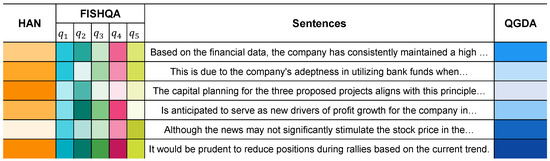 In this example article, our QGDA model clearly assigns high attention weights to the first and last sentence, effectively highlighting the most salient parts of the document for sentiment judgment. In comparison, the HAN model’s attention weights are relatively average across sentences. Additionally, the distribution of attention weights between different queries in FISHQA appears less regular, which may complicate the interpretability of its attention mechanism at a granular level. However, from the perspective of financial analysis, the ability to clearly identify which sentences in a document (via our combined attention ) or which underlying financial concepts (via query attention v) play a crucial role in the sentiment analysis model provides a direct and tangible degree of explainable basis. Even if it is difficult to quantify precisely, this qualitative insight into the model’s reasoning is invaluable for financial professionals seeking to understand the `why’ behind a prediction.