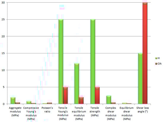 The tensile Young’s modulus (Et) shows higher values than in compression, as the network of collagen fibres plays a key role in tension []. Depending on the layer and the direction relative to the collagen system, the values of this parameter can be in the range of 5–25 MPa at equilibrium []. It has been shown that Et values can be more than twice as high in the direction following the fibre orientation as opposed to the perpendicular direction []. The values of this parameter decrease with age or during the progression of degenerative diseases [].