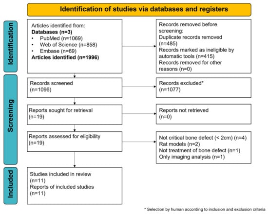 A flow diagram, according to the PRISMA 2020 guidelines, is illustrated in Figure 1. A total of 1996 articles were initially identified using the search strategy, comprising 1069 in PubMed, 858 in Web of Science, and 69 in Embase. After 485 duplicates were removed and 415 records were identified as ineligible by automatic tools, 1096 records were screened by title and abstract, resulting in the selection of 19 articles. The full text of these articles was assessed, and eight of these articles were excluded for at least one of the following reasons: bone defect <2 cm (n = 4), not a large animal model (n = 2), no treatment of a bone defect (n = 1), and histological analysis was not performed (n = 1). In total, 11 studies were included in the final qualitative synthesis.