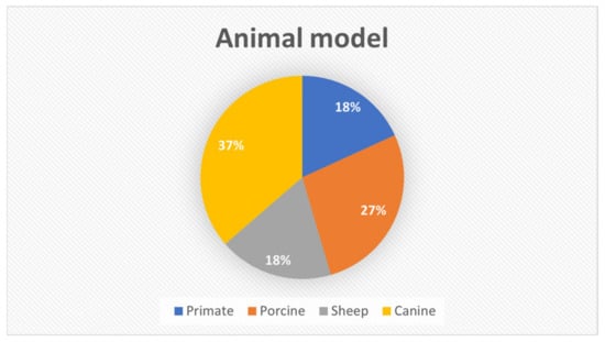 The animal models used in the studies included in this review varied among canine (37%), porcine (27%), sheep (18%), and primate (18%) (Figure 2).