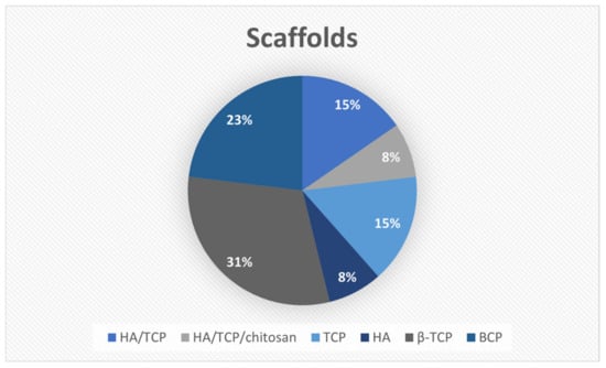 Calcium phosphates were the most widely used ceramics, with β-TCP (31%) and BCP (23%) being the most prevalent. Figure 3 illustrates the distribution of the ceramic materials used for scaffold fabrication.