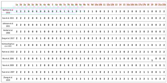 This figure shows the level of compliance with the ARRIVE guidelines [] among the studies included in the qualitative synthesis. The evaluated elements were: study design, referring to the description of the experimental setup and comparison groups; randomization, regarding whether the method of random allocation was reported; data availability, indicating if the study stated whether and where its data could be accessed; scientific background, assessing the clarity of the rationale and context provided for the research; and experimental approach, referring to the detailed description of the procedures used. Each item was scored on a scale from 0 to 2, where 0 indicates the item was not reported, 1 indicates it was partially reported, and 2 indicates full reporting in accordance with the guidelines [,,].