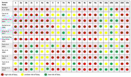 Figure 4 illustrates the compliance with the ARRIVE guidelines for all studies included in the qualitative synthesis. All studies provided clear details about their design, including the groups being compared. None of the studies provided clear information regarding the randomization method used to allocate experimental units, although Paré et al. (2022) [] and Wu et al. (2006) [] offered partial details. Nokhbatolfoghahaei et al. (2022) [] partially described whether and where study data are available, while the remaining studies did not provide any information on this matter. All studies included an adequate scientific background to understand the rationale and context of the research and detailed their experimental approaches.